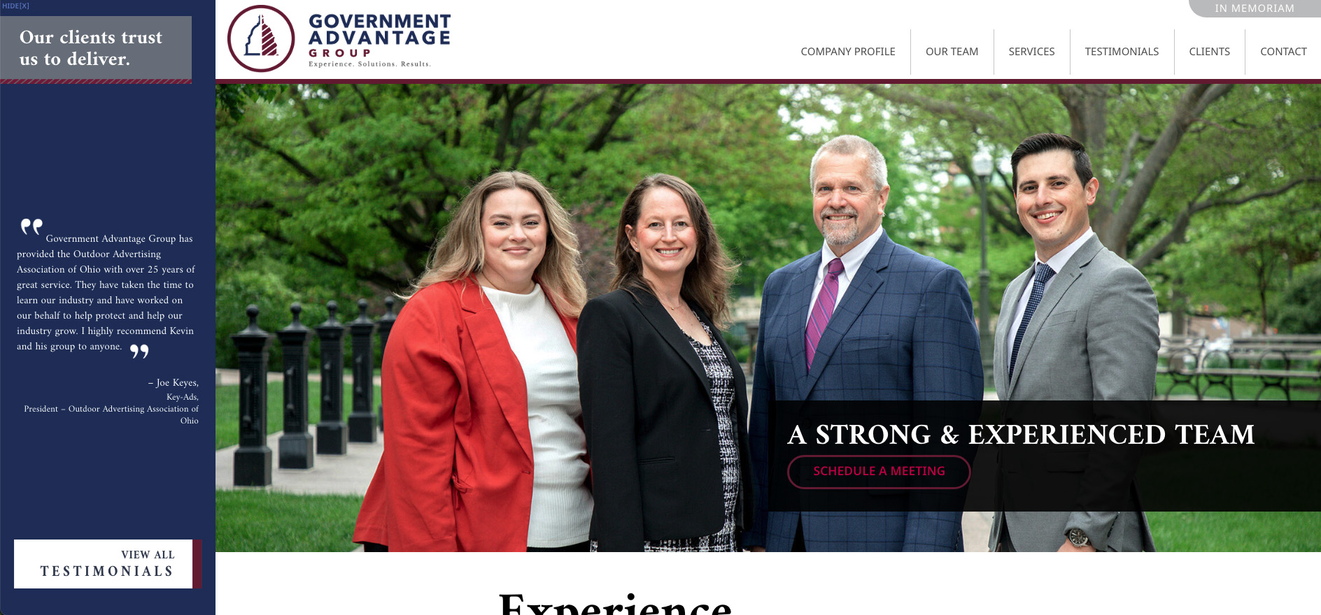 This website was originally built in 2016 for Government Advantage Group, a lobbying firm based out of Columbus, Ohio which was brand new at the time. They needed a website that would look professional and patriotic without looking partisan. I first created a new logo and identity package utilizing both red and blue, then transferred those colors over to the website.