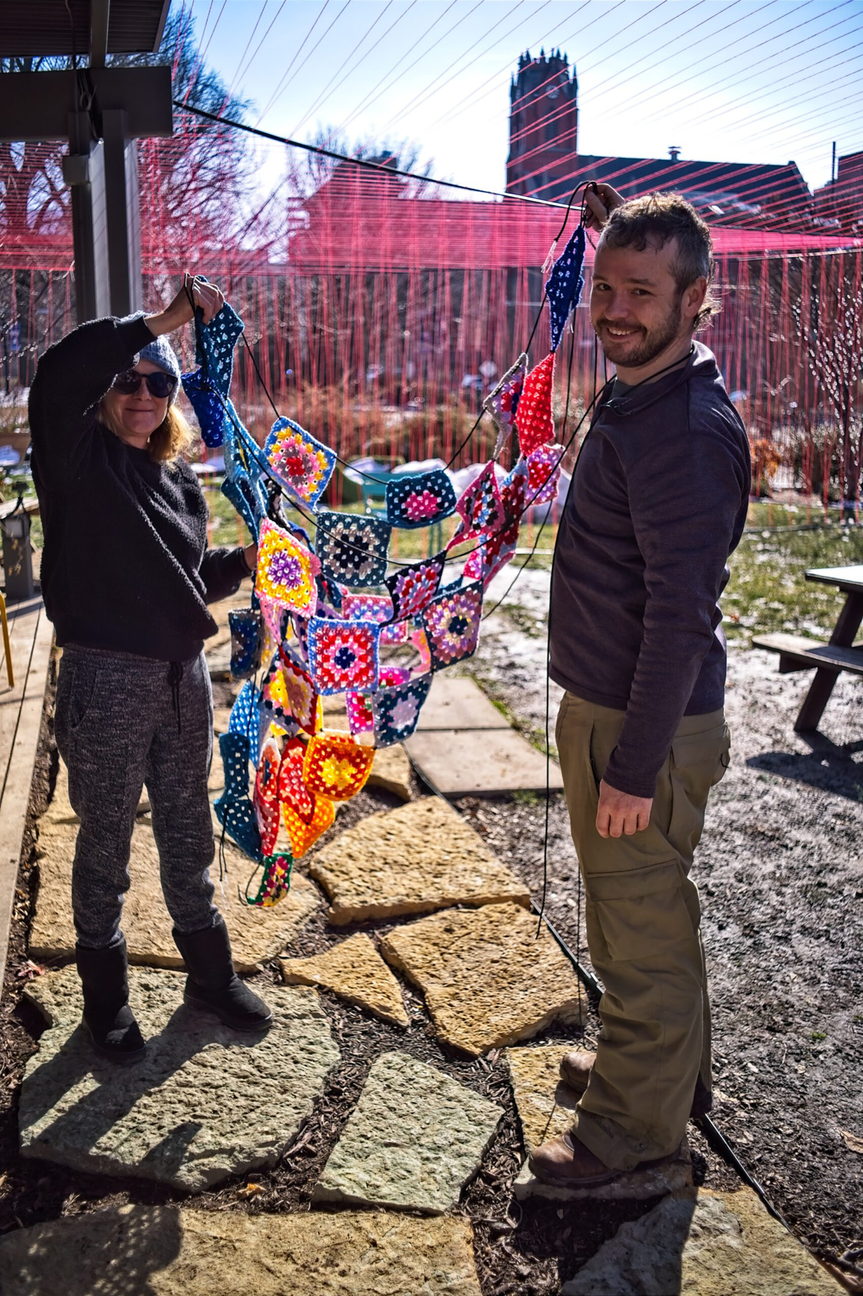 A local photographer walked through the area as we were installing the granny squares in the red and orange alcoves and ended up sending over these great pictures. It’s worth noting that these pictures show the piece before the lower edge of the granny squares had been secured properly to the base.