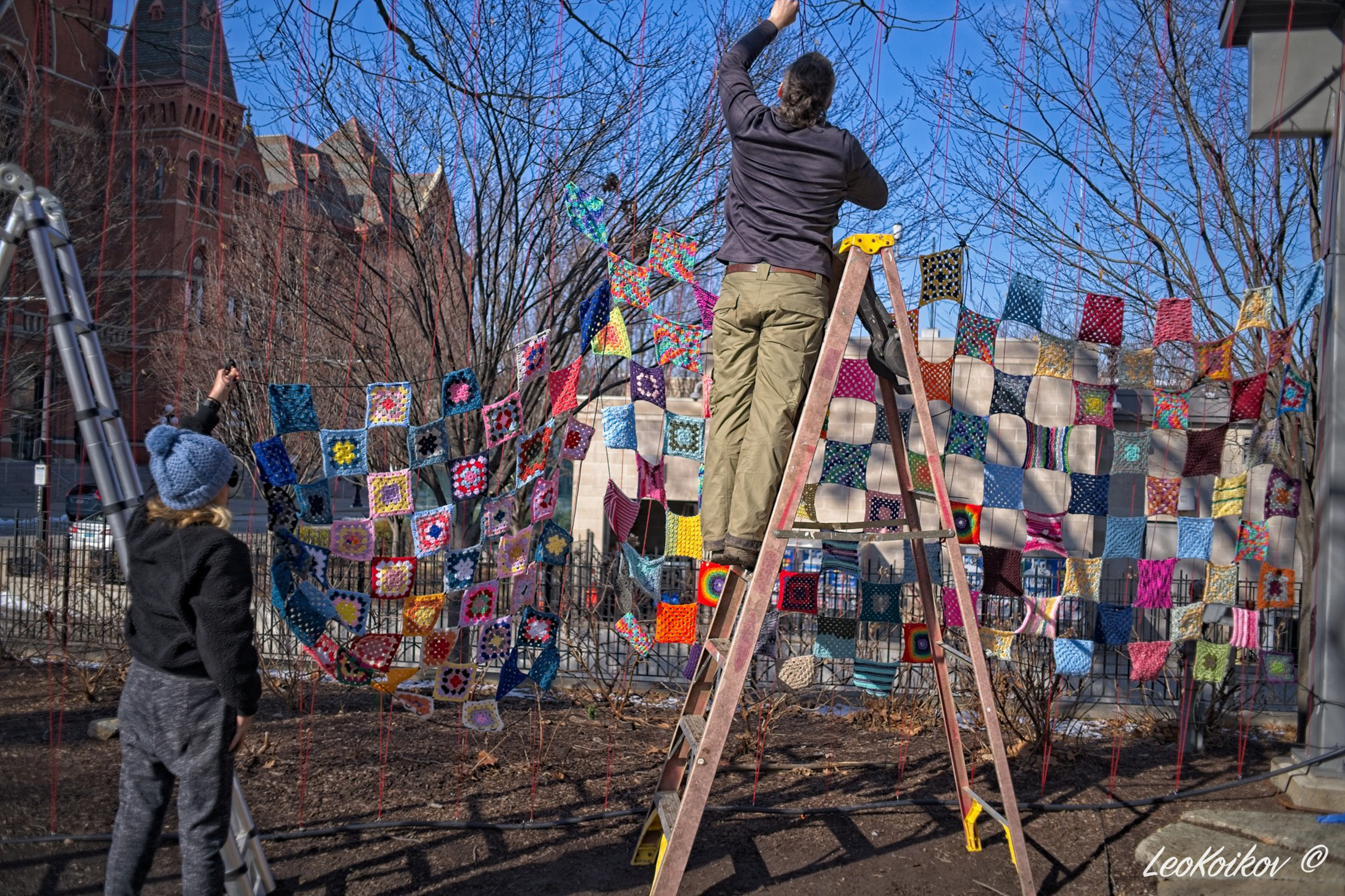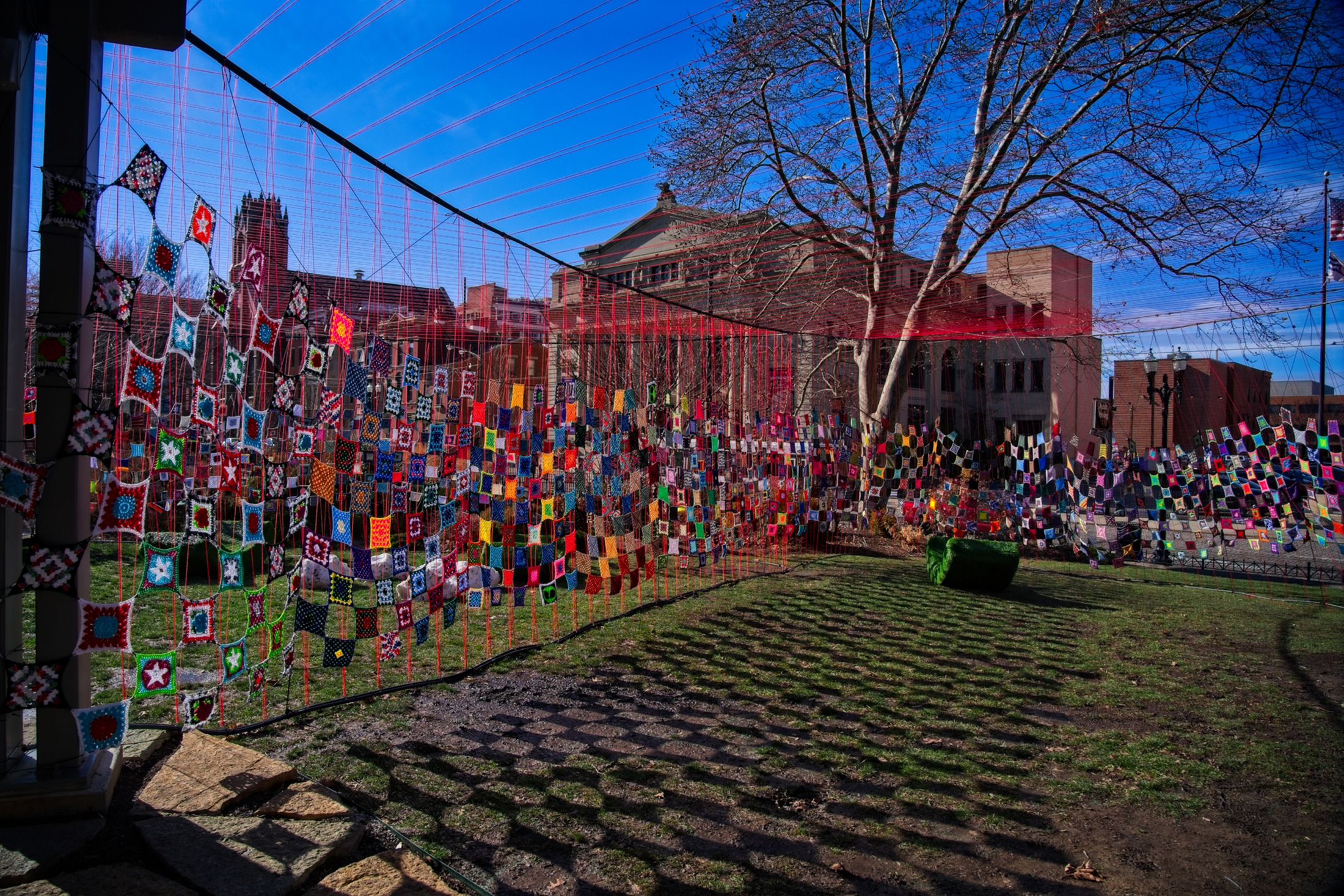 Weather was an issue during installation, as one might expect when installing in January. Below is a video showing the piece the day after the majority of the granny square sections had been hung from the overhead wires but before they had been secured to the ground. It also rained/sleeted the night before so this was a true stress test for the piece. High gusts of cold wind made the job difficult as everything turned into a kite, but it also provided a needed stress test for the piece that allowed for fewer adjustments later during the duration of the time the piece remained installed.
